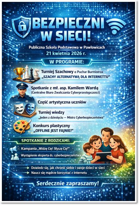 Już 21 kwietnia 2026 r. w naszej szkole odbędzie się wyjątkowe wydarzenie poświęcone bezpieczeństwu w Internecie oraz promowaniu wartościowego spędzania czasu offline. Przygotowaliśmy bogaty program dla uczniów, rodziców i nauczycieli!